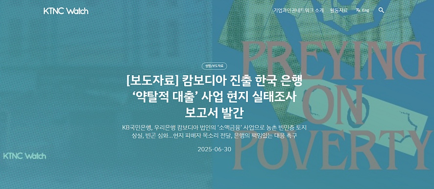 ប្រភពដដែលបន្តថា របាយការណ៍ដែលមានចំណងជើងជាភាសាអង់គ្លេសថា Preying on Poverty ឬជាភាសាខ្មែរថា “ការទាញប្រយោជន៍ពីភាពក្រីក្រ” ត្រូវបានចេញផ្សាយដោយក្រុមអ្នកឃ្លាំមើលសាជីវកម្មកូរ៉េអន្តរជាតិ (KTNC Watch) នាថ្ងៃទី៣០ខែមិថុនា ឆ្នាំ២០២៥ បានបង្ហាញពីព័ត៌មានលម្អិតទាក់ទងនឹងការរំលោភបំពានសិទ្ធិមនុស្សដែលប្រព្រឹត្តដោយធនាគារ ខេប៊ីប្រាសាក់ និងធនាគារអ៊ូរីប៊ែង។ របាយការណ៍បន្តថា ធនាគារទាំងពីរនេះ ជាអតីតស្ថាប័នគ្រឹះស្ថានមីក្រូហិរញ្ញវត្ថុ ហើយក្រោយមកត្រូវបានទិញយកដោយធនាគារកូរ៉េធំៗមួយចំនួននារយៈពេលប៉ុន្មានឆ្នាំចុងក្រោយនេះ ។